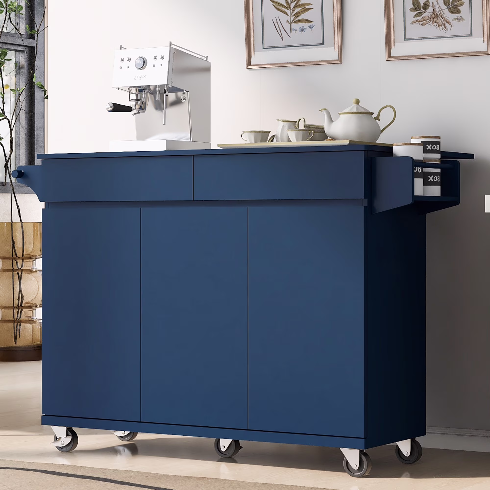 53.2'' Kitchen Island with Drop Leaf, Kitchen Storage Cart with Spice Rack, Towel Rack and 2 Drawers, Rolling Kitchen Island on Wheels with Adjustable Shelves, Navy Blue
