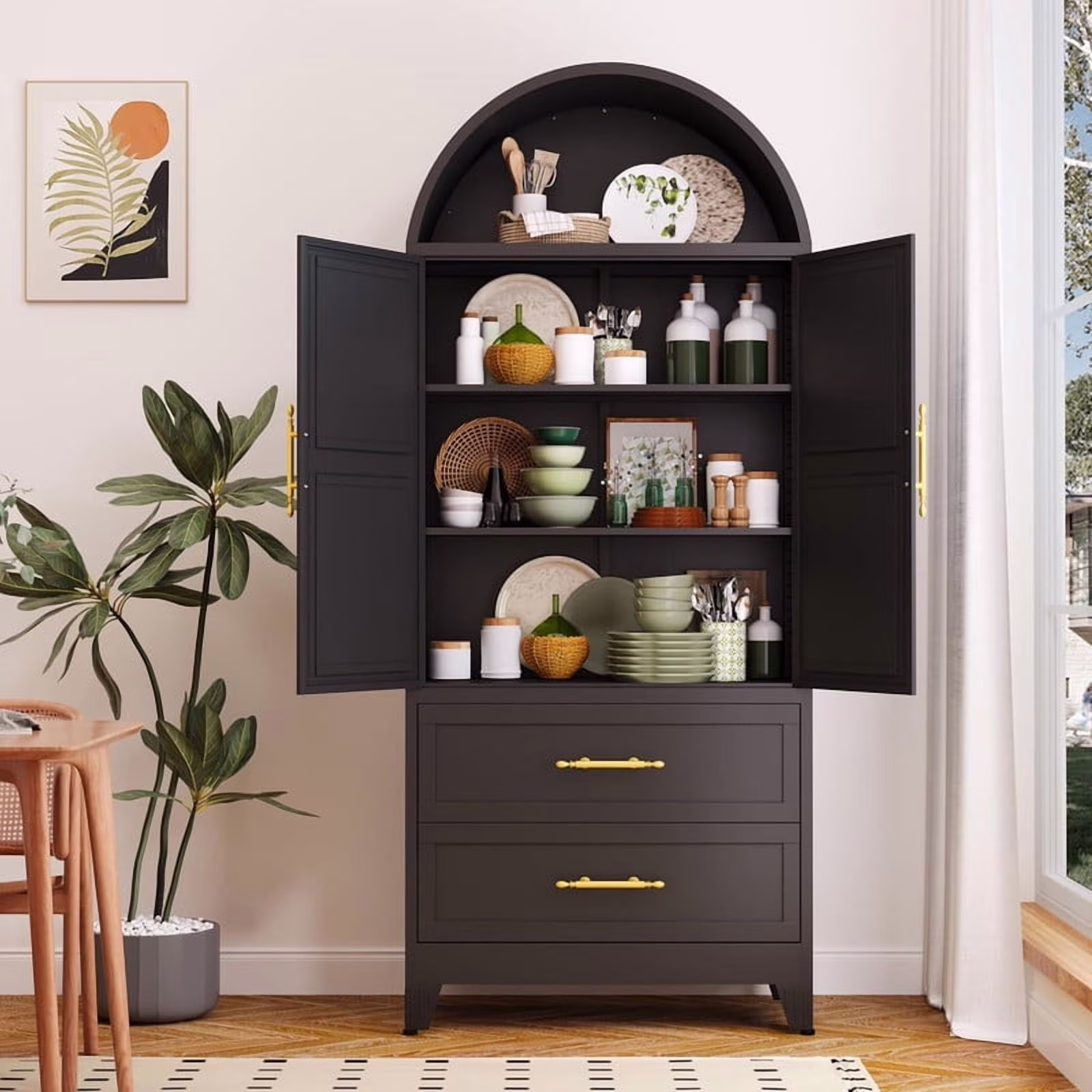 Erosoei Modern Metal Kitchen Pantry Storage Cabinet, Arched Pantry Cabinet with Shelves and Doors and 2 Drawers