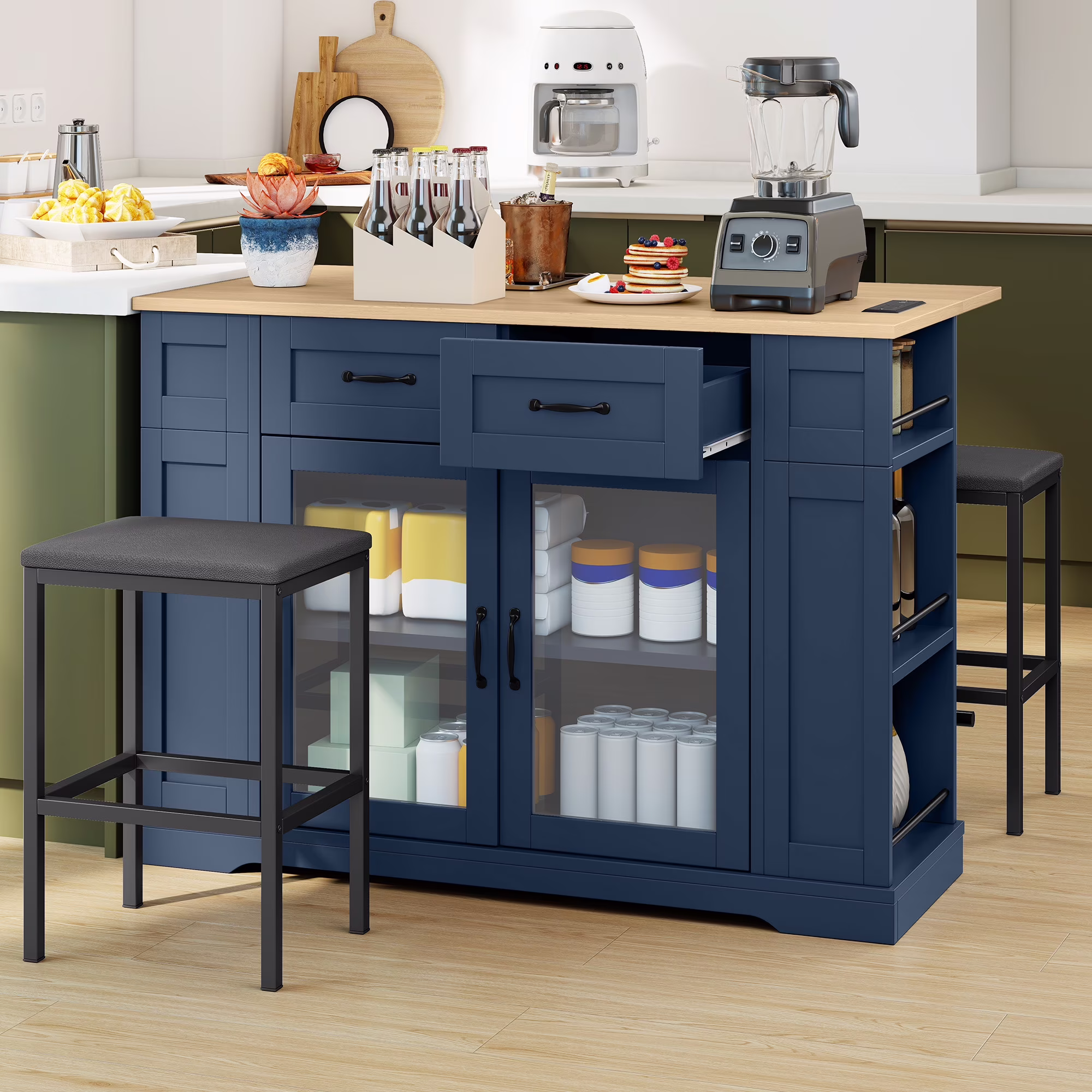 Uforic Kitchen Island Table with Storage Drawers & Shelves, Kitchen Island with Drop Leaf & Seating, Blue
