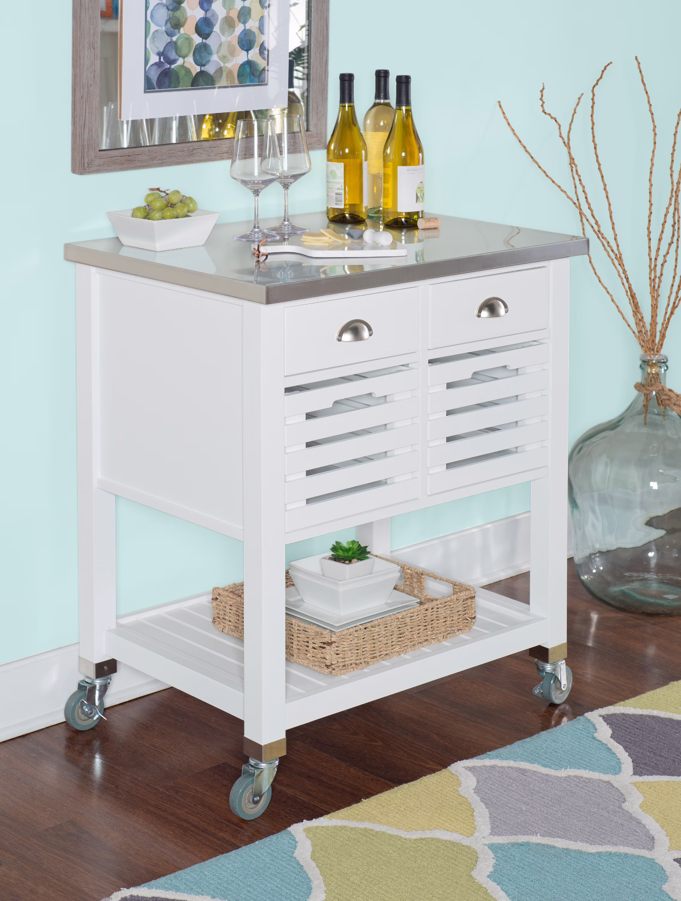 Linon Kerr 2-Drawer 2-Tier Mobile Serving Cart with Stainless Steel Top, 22" Length, White