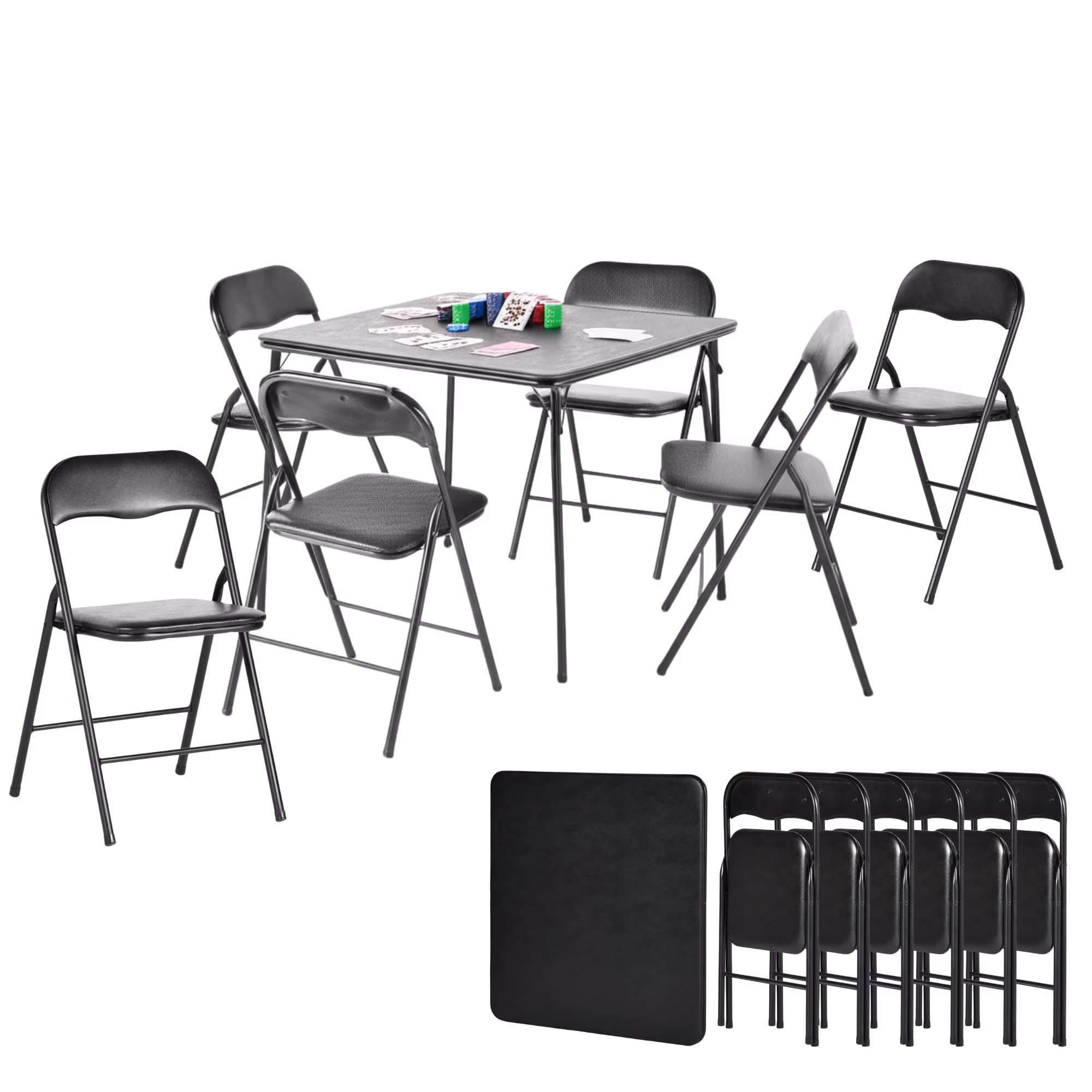 7 Piece Folding Card Table with 6 Foldable Chairs �C 33.9 Inch Square Metal Construction for Indoor & Outdoor Games and Recreation Black