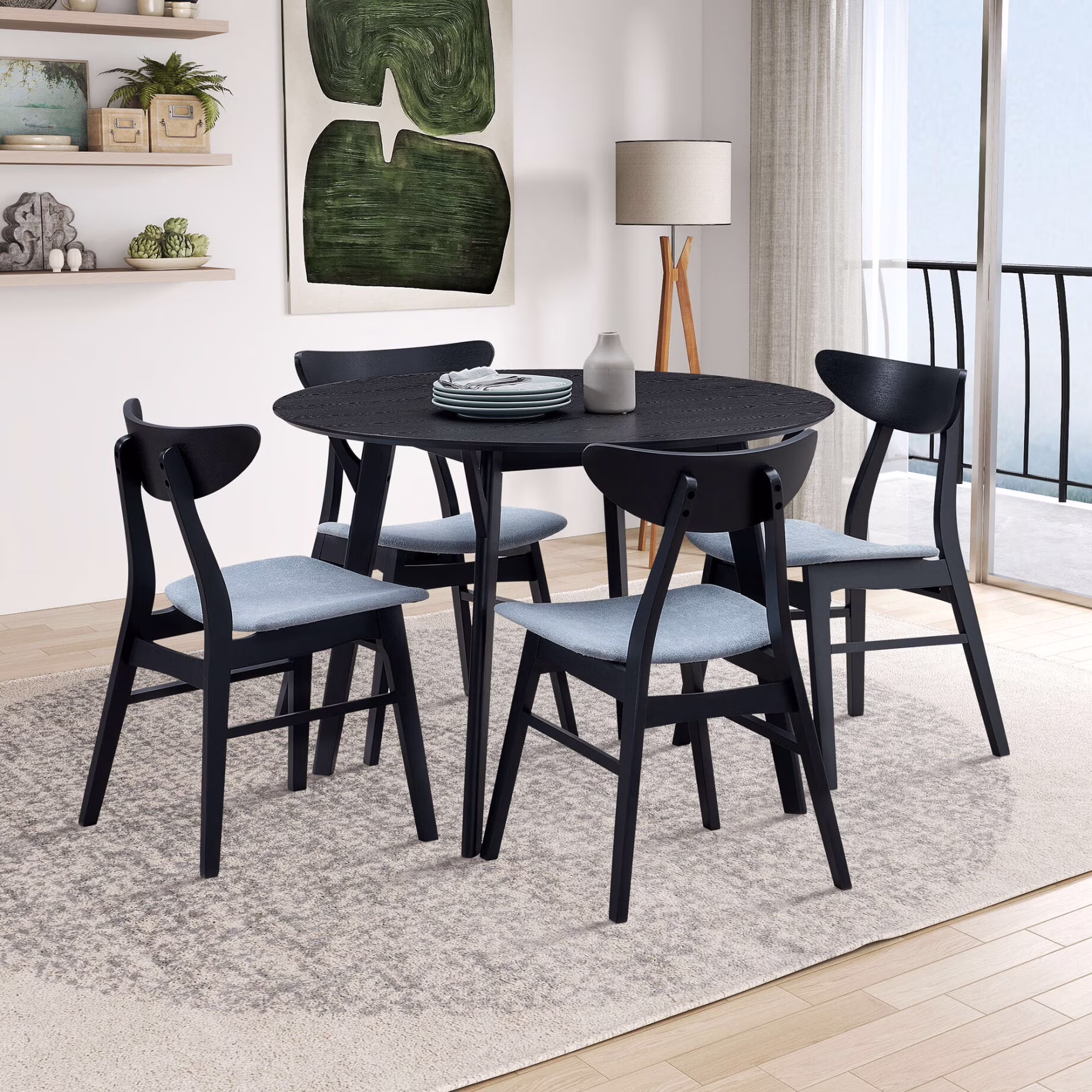 Dining Table Set for 4, Compact Mid-Century Modern Table & Chair Set for Home, Apartment w/ 4 Chairs, Padded Seats & Wooden Frame, Black