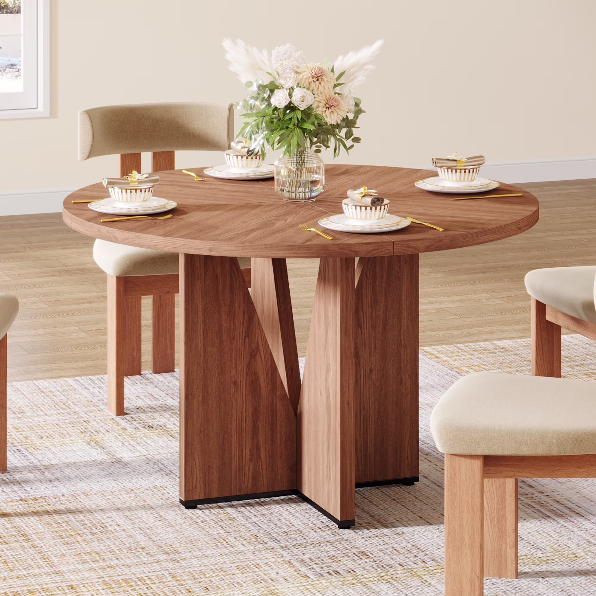 LIKEMET 47 Inch Round Dining Table for 4, Kitchen Tables with Pedestal Heavy Base for Dining Room, Kitchen, Living Room, Walnut