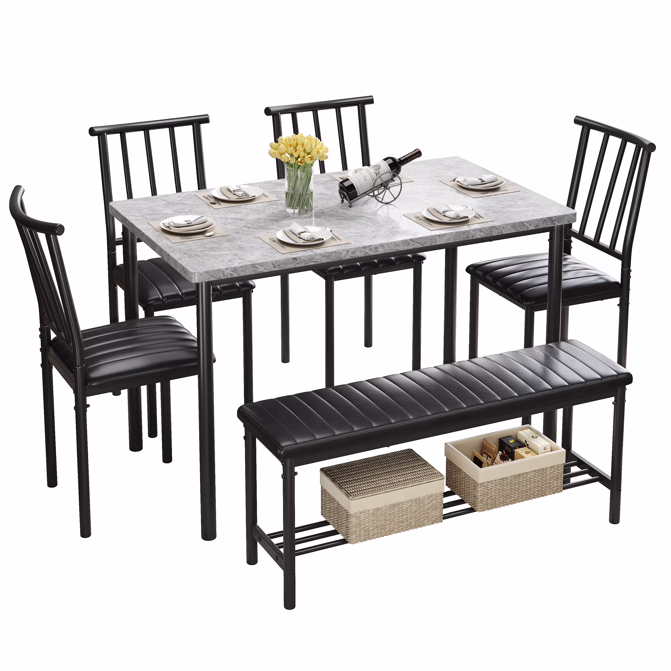 PORKISS Dining Table Set for 6, 6 Piece Dining Room Set with 4 PU Leather Chairs and Bench, Kitchen Dining Table and Bench Set with Storage Rack, Modern Kitchen Furniture Set for Home, Gray+Black