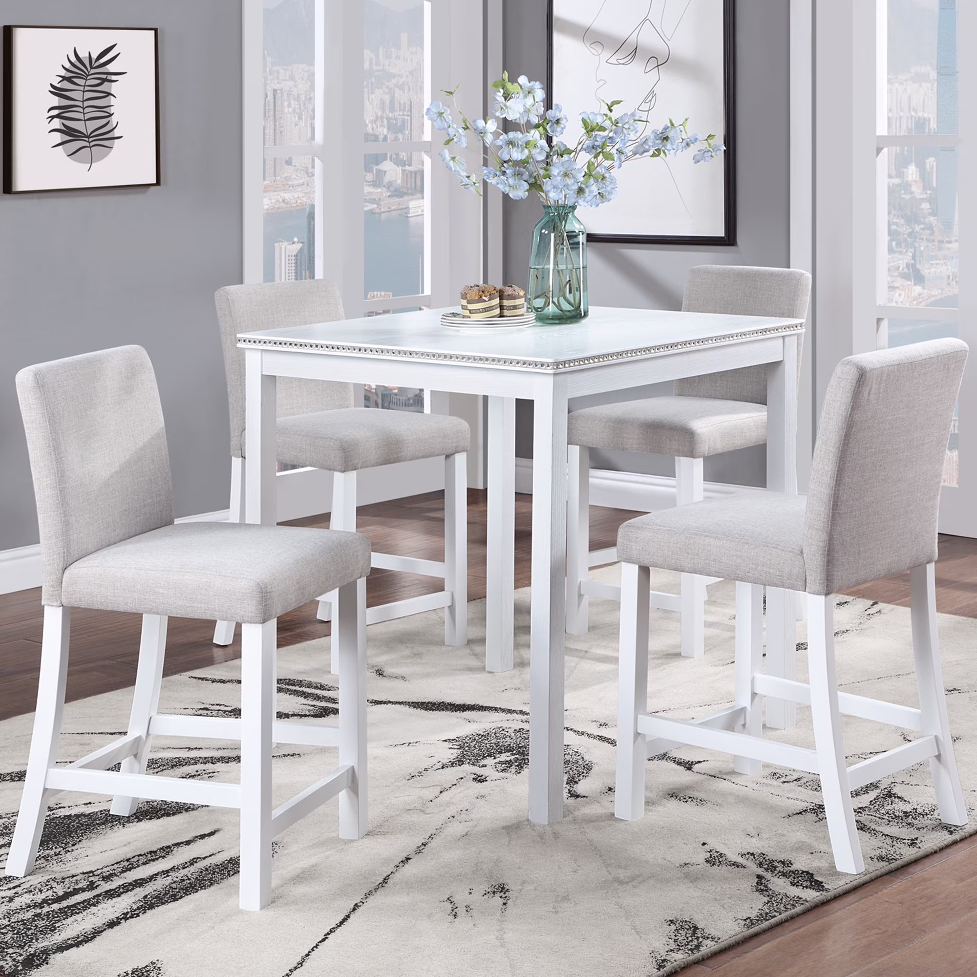 PAPROOS Dining Table Set for 4, 5 Piece Solid Wood Dining Room Set with Square Table and 4 Upholstered Chairs, Counter Height Kitchen Table with Crystal Decoration and Chair Set, White