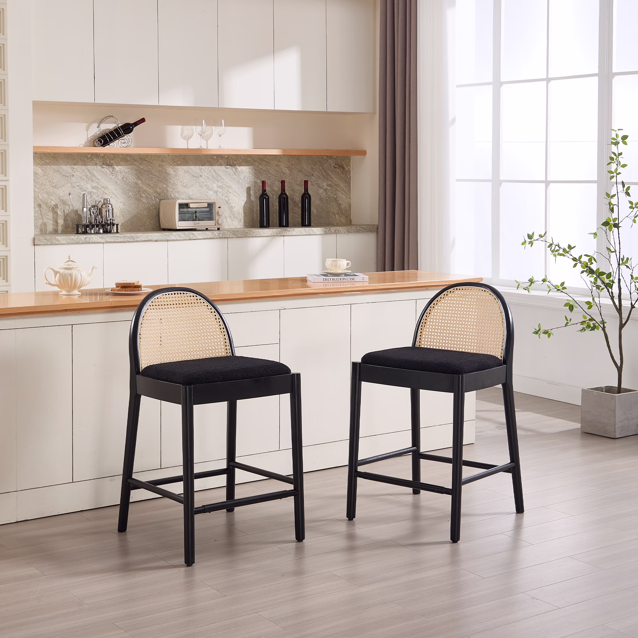 Guyou Modern Bar Stools Set of 2, 26" Counter Height Bar Stools with Natural Rattan Back and Solid Wood Frame, Sherpa Upholstered Kitchen Island Chairs for Bar Island Cafe Kitchen, Black