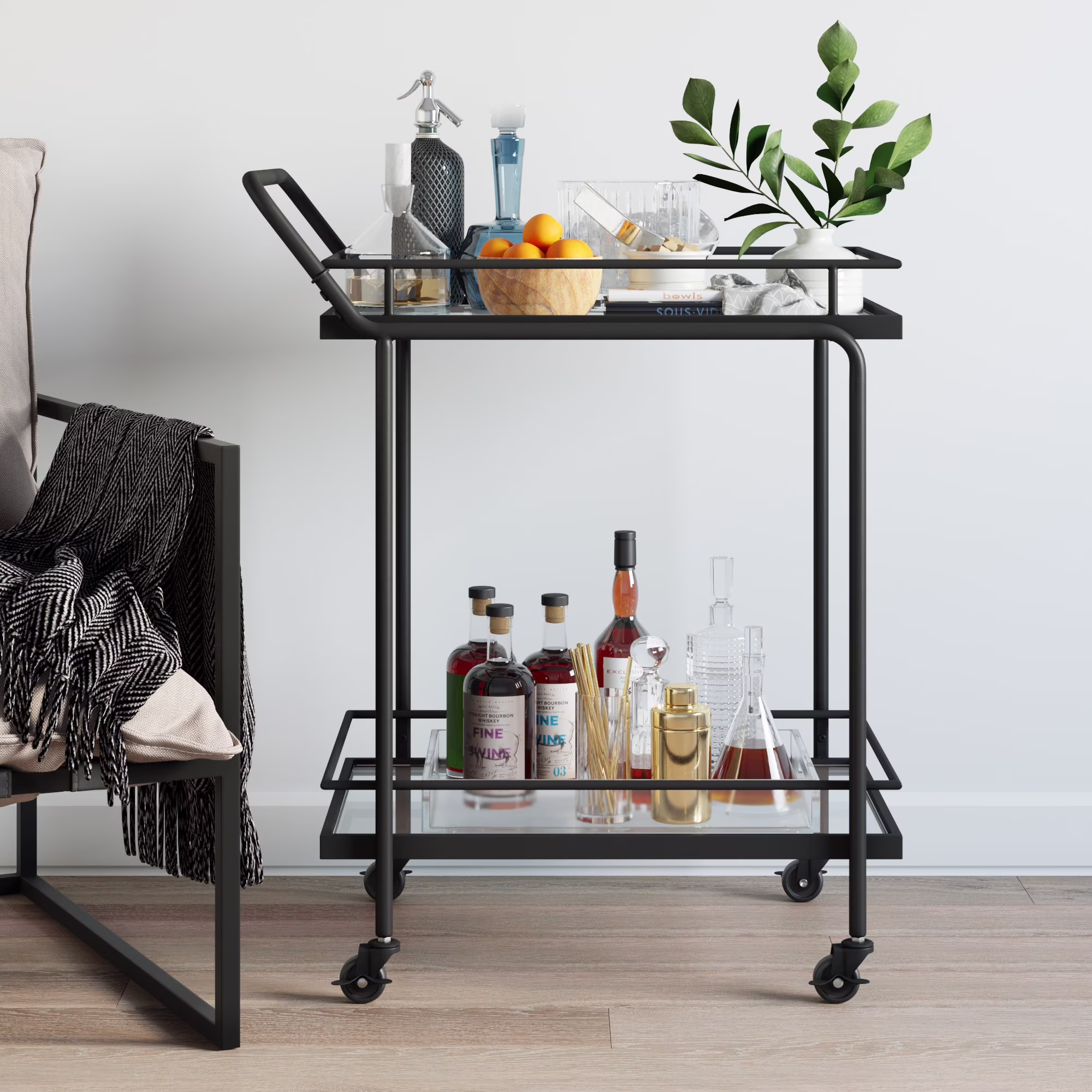 Nathan James Sally 2-Tiered Black Metal Frame Glass Rolling Bar Cart and Tea or Cocktail Cart