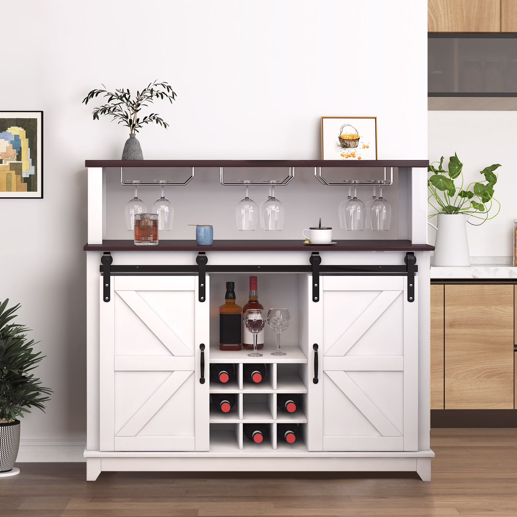 Glavbiku Farmhouse Coffee Bar Wine Cabinet W/ Sliding Barn Door,Sideboard Buffet W/ Wine Rack,White