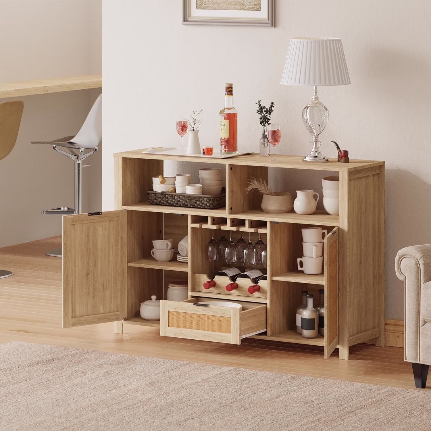 EROMMY Wine Bar Cabinet, 51" Rattan Sideboard Buffet Cabinet with Wine Rack and Cup Holders, Natural Oak