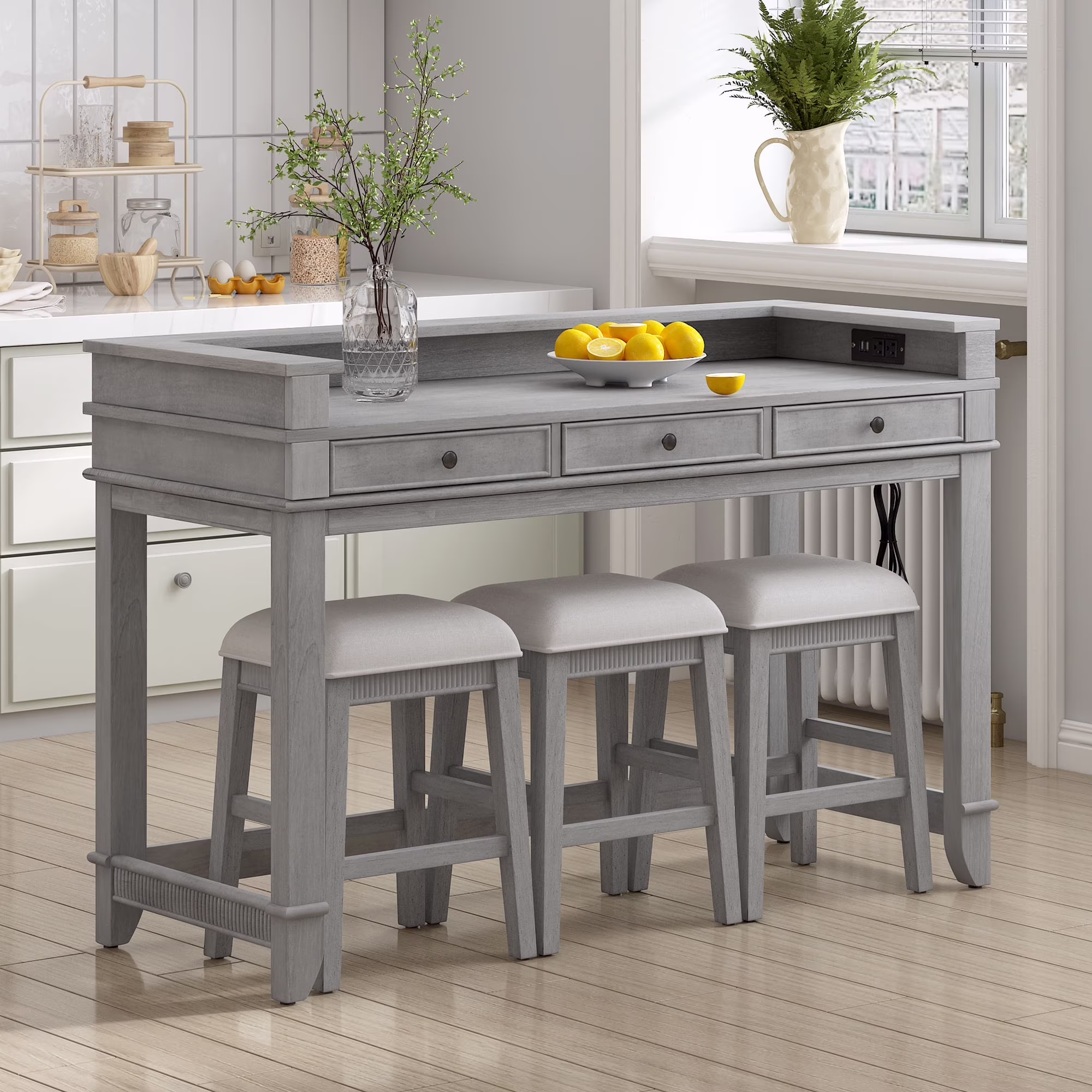 Harper & Bright Designs 4 Piece Bar Table Set for 4, Kitchen Dining Stools Set with 3 Upholstered Stools with 3 Drawers and USB Port, Gray