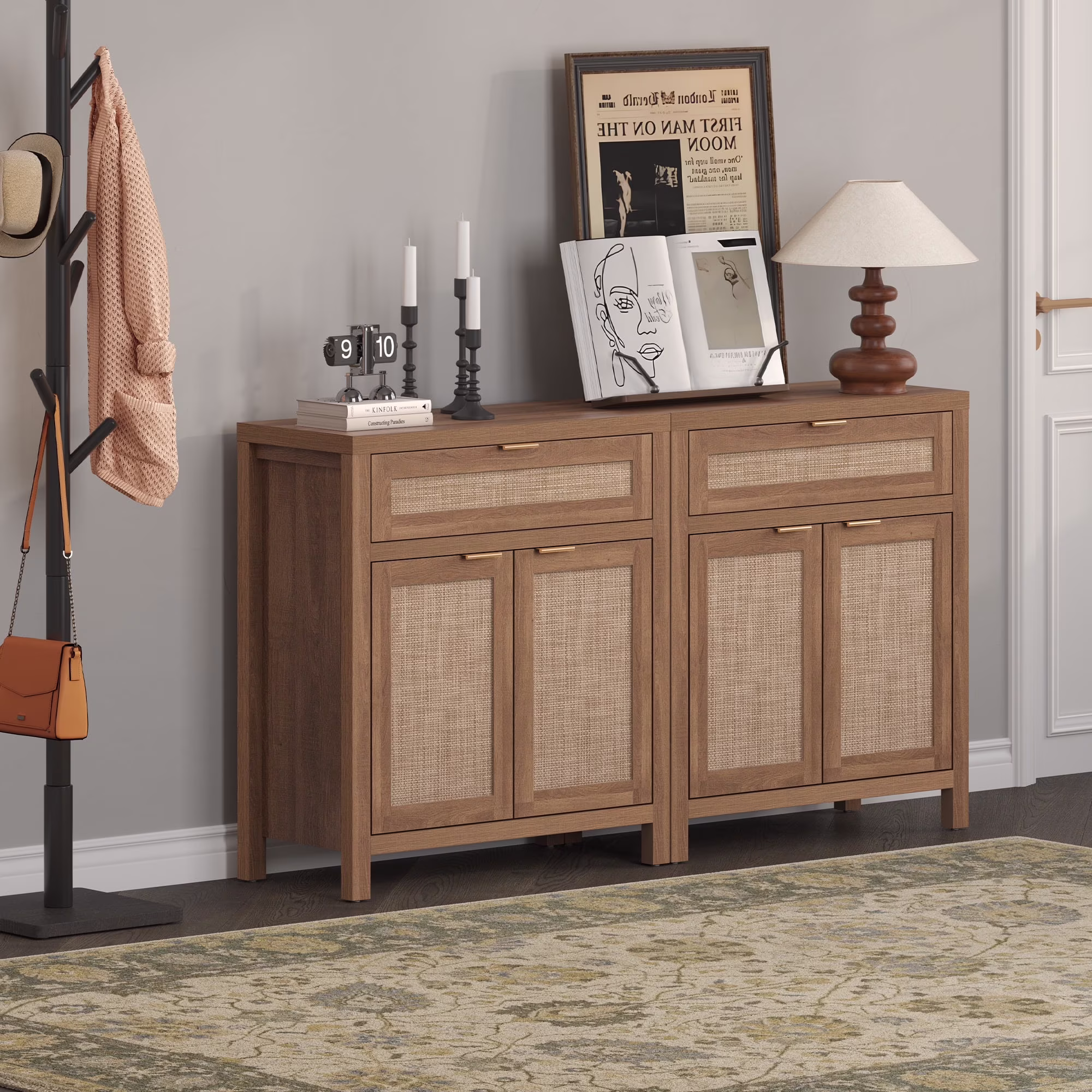 Surmoby Sideboard Buffet Cabinet Set of 2,Boho Storage Cabinets with Rattan Doors and Drawer,Farmhouse Accent Cabinet for Dining Room Living Room(Oak,2PCS)