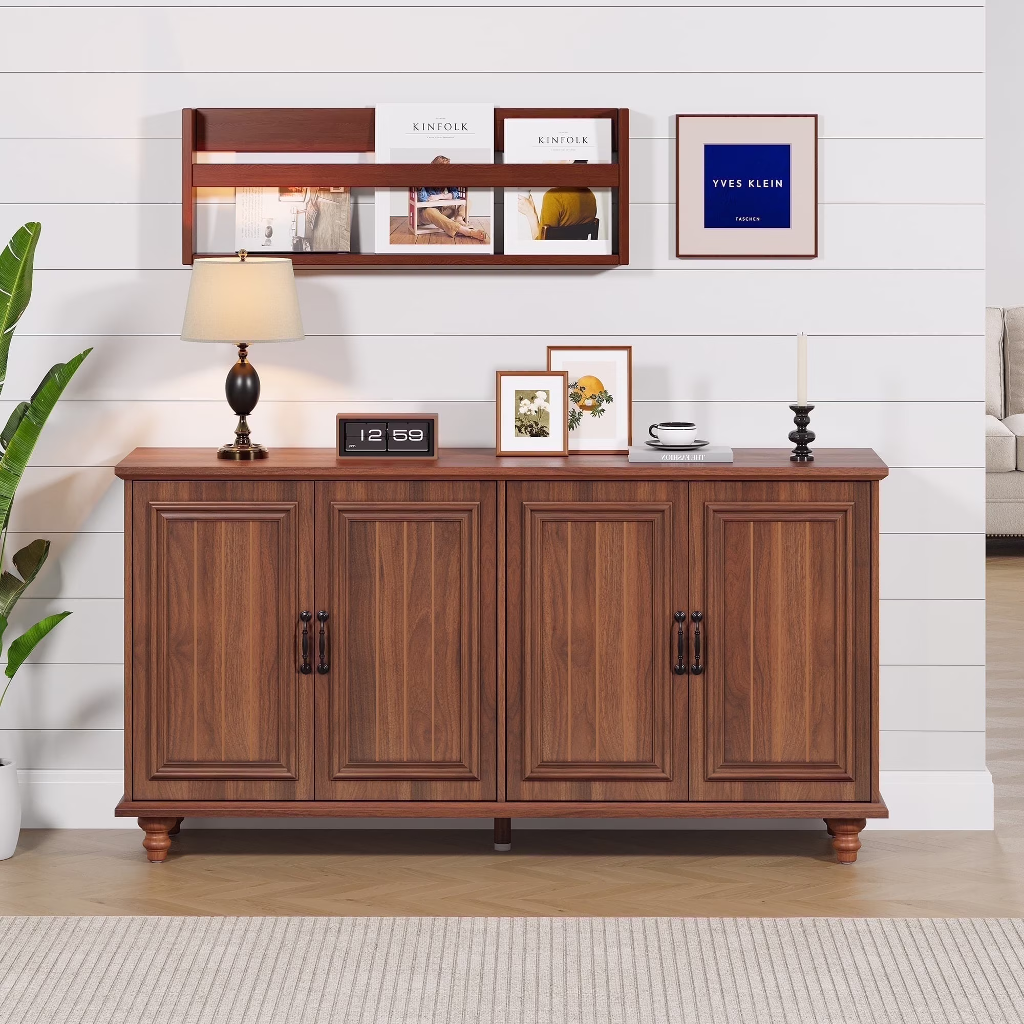YOCWO Walnut Sideboard and Buffets, Mid Century Storage Cabinets with 4 Doors and Adjustable Shelves Buffet Cabinet for Kitchen Dining Room Living Room Bedroom