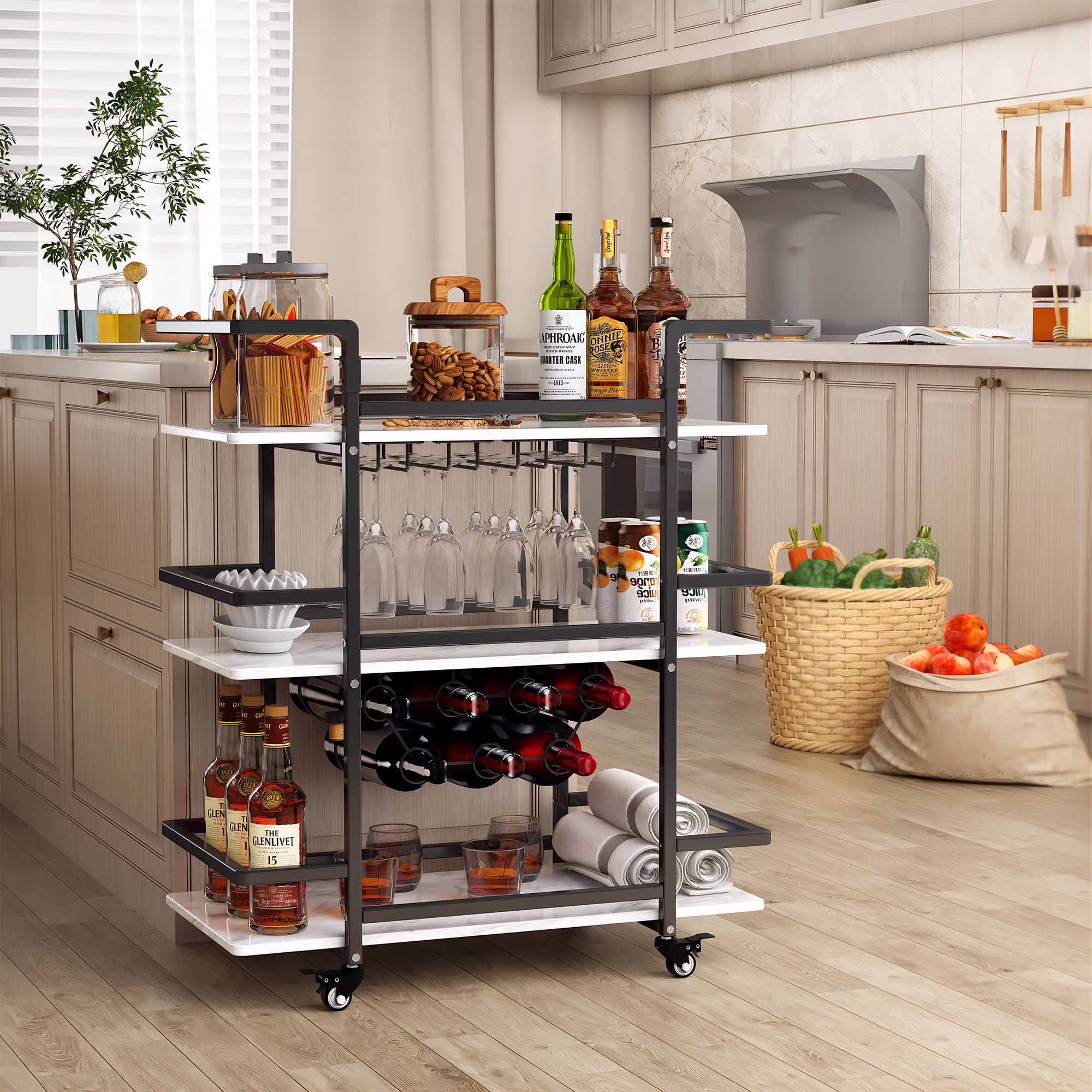 BENOSS 3-Tier Home Bar Cart with Wine Rack and Glass Cup Storage, Mobile Serving Wine Cart on Wheels, Modern Drink Trolley for Coffee Tea Wine, Beverage Bar Table for Home Kitchen Party, Black