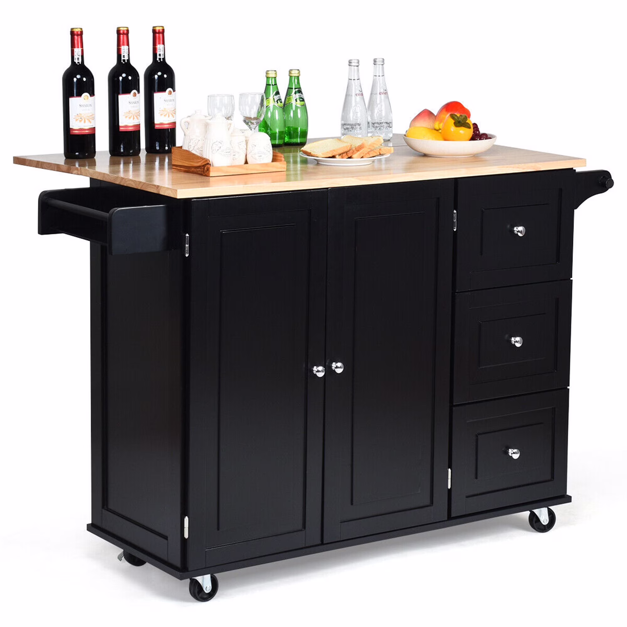 Gymax Drop-Leaf Kitchen Island Trolley Cart Wood Storage Cabinet w/ Spice Rack Black