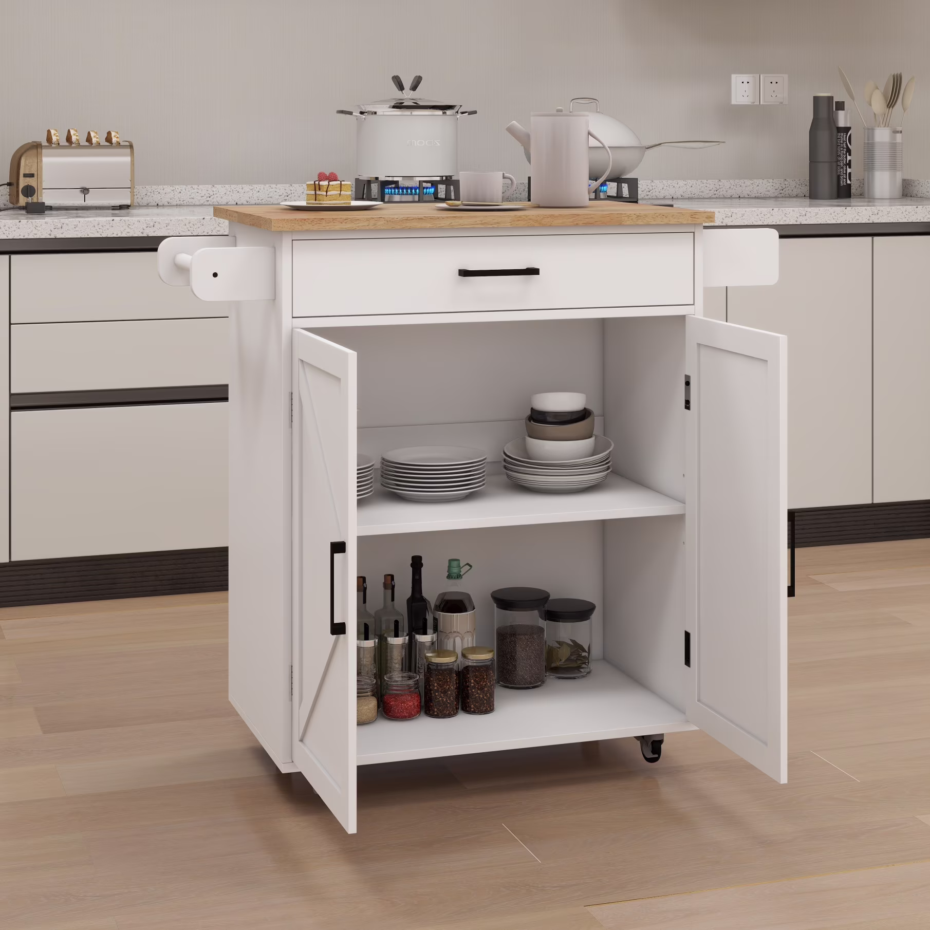 Rolling Kitchen Island with Solid Wood Top & Pull-out Drawer, Kitchen Trolley Cart with Spice Rack & Towel Rack & Storage Pantry Cabinet with Adjustable Shelf, Kitchen Island Cart on Wheels, White