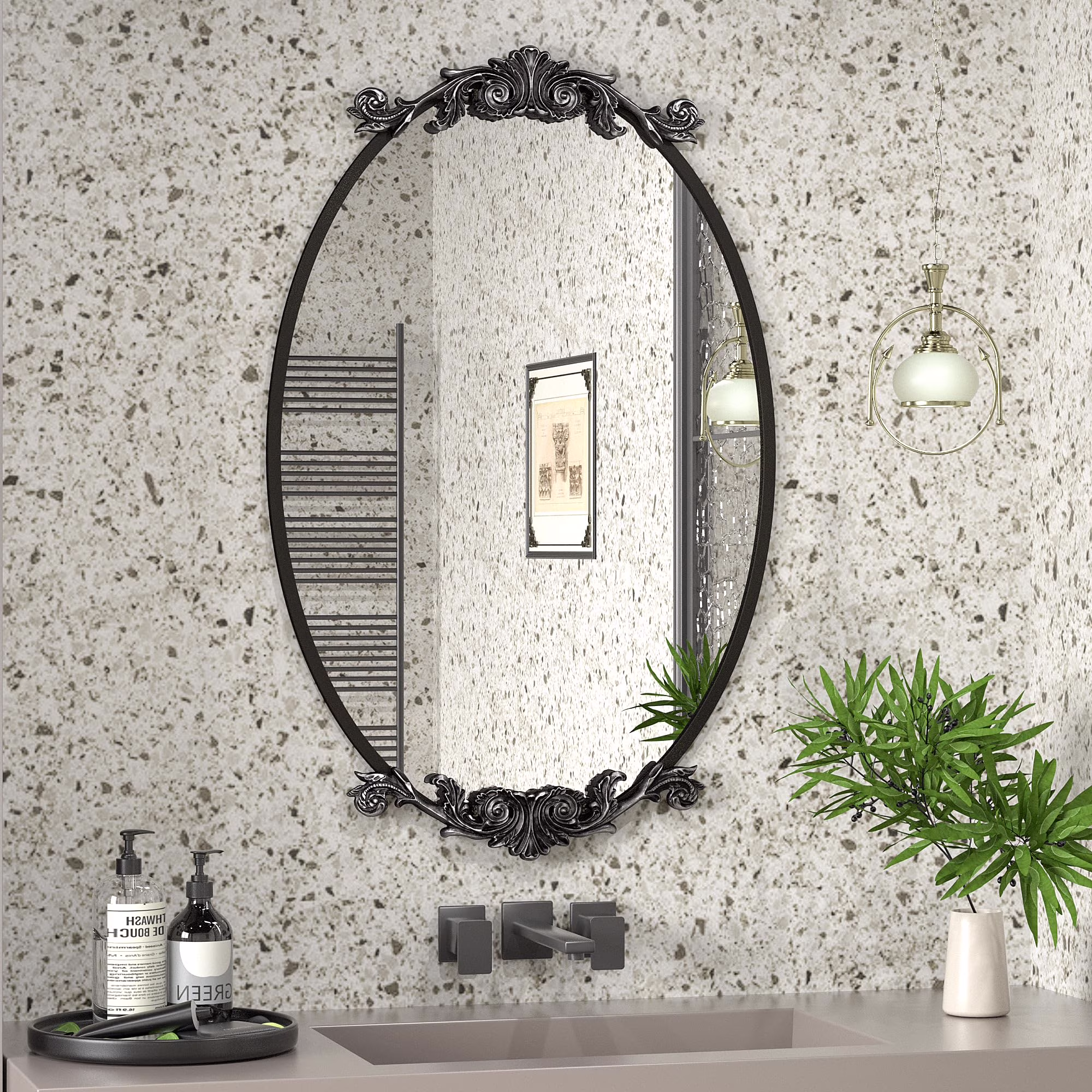 Apmir Arched Wall Mirror Oval Vintage Carved Antique Metal Frame for Bathroom