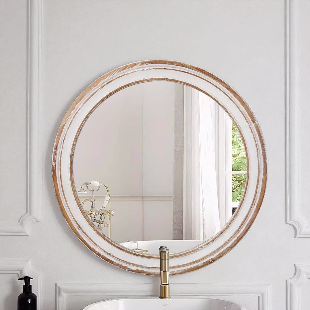 GZXS Farmhouse Round Wall Mirror with Antique Natural Finished Wood Frame, 35.4 Inches Rustic Decorative Mirror for Bathroom Vanity, Bedroom, Living Room, Entryway