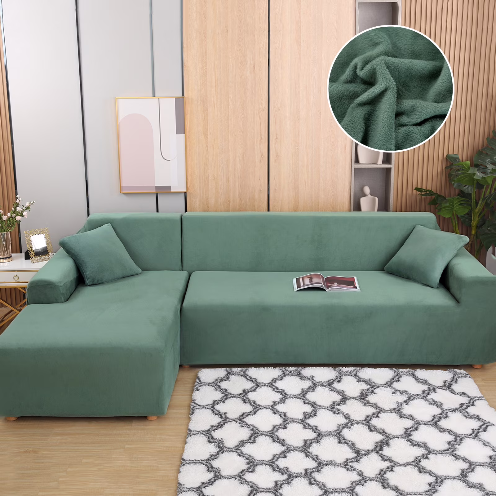 SHANNA Sectional Sofa Slipcovers Thick Velvet L Shape Couch Covers, 2Pcs Stretch Anti-Slip Sofa Covers 3 Seater + 3 Seaters Chaise Cover Furniture Protector,Green