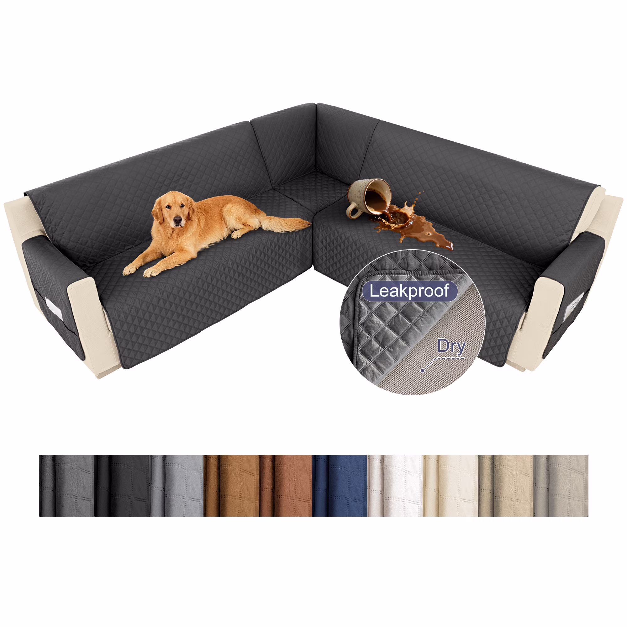 HDCAXKJ 100% Waterproof Sectional Corner Sofa Covers Quilted Couch Covers Non Slip L Shape Sofa Slipcovers with Pockets Furniture Protector for Pets Kids,Large,Dark Gray