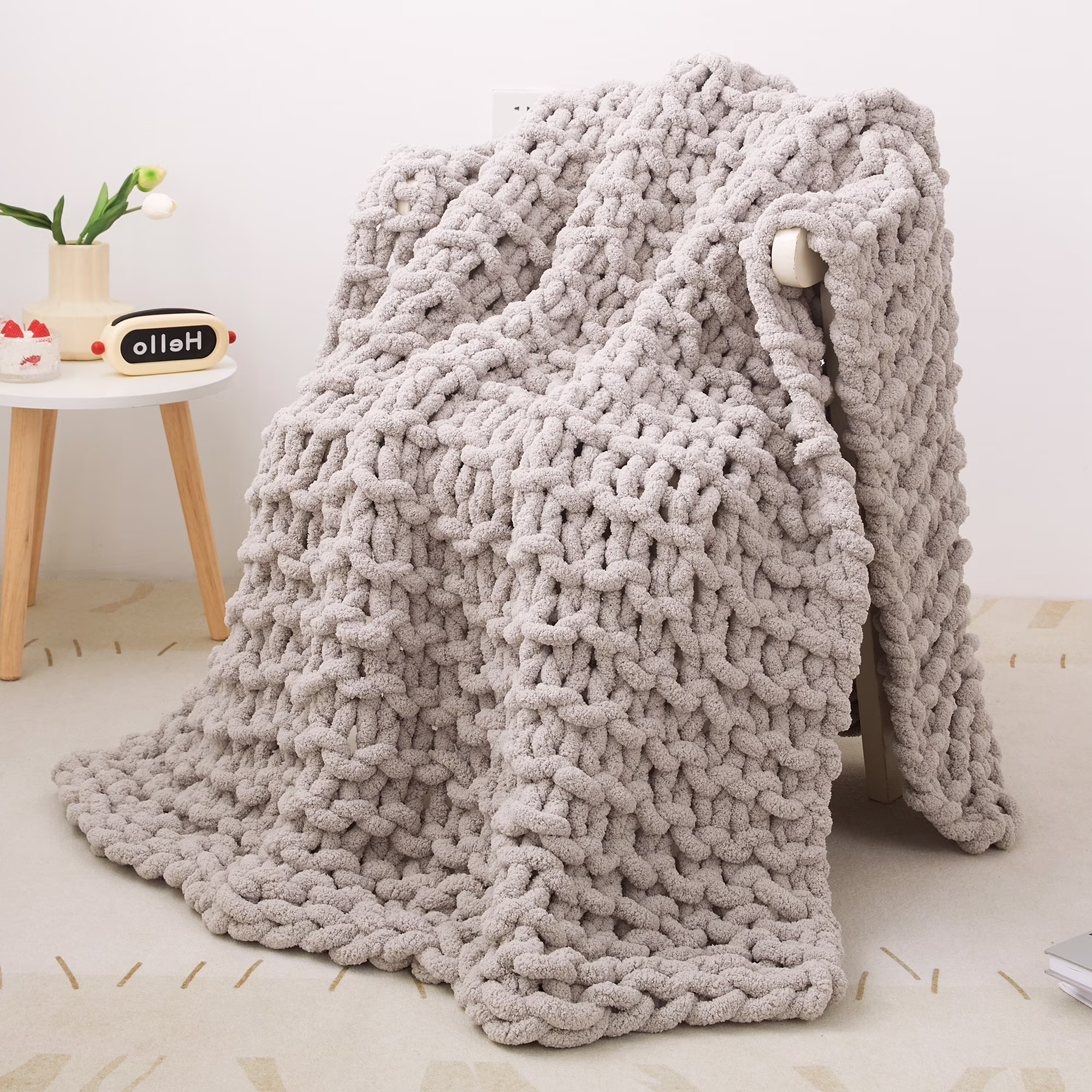 Mooreeke Chunky Knit Blanket 30"x40" Light Grey Soft Washable Chenille Throw Blanket Cozy 100% Handmade Crochet Blankets with Jumbo Chenille Yarn for Couch Bed Sofa Room Decor